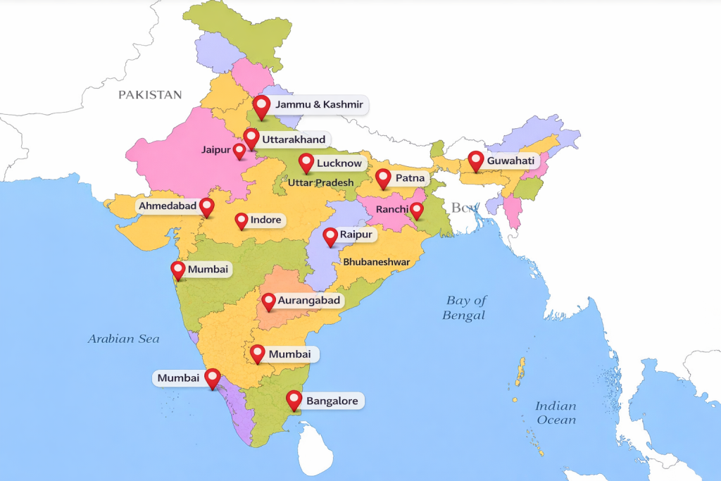 Our operational network covers Delhi NCR, Uttar Pradesh, Jaipur, Ahmedabad, Mumbai, Pune, Bhopal, Bangalore, Hyderabad, Chennai, Kolkata, Ranchi, Jammu & Kashmir and many more locations — ensuring timely delivery and seamless project execution.